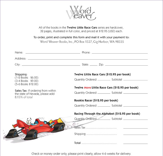 Home  -  Info  -  Books:  Twelve Little Race Cars  -  Twelve More Little Race Cars  -  Rookie Racer  -  Racing Through the Alphabet